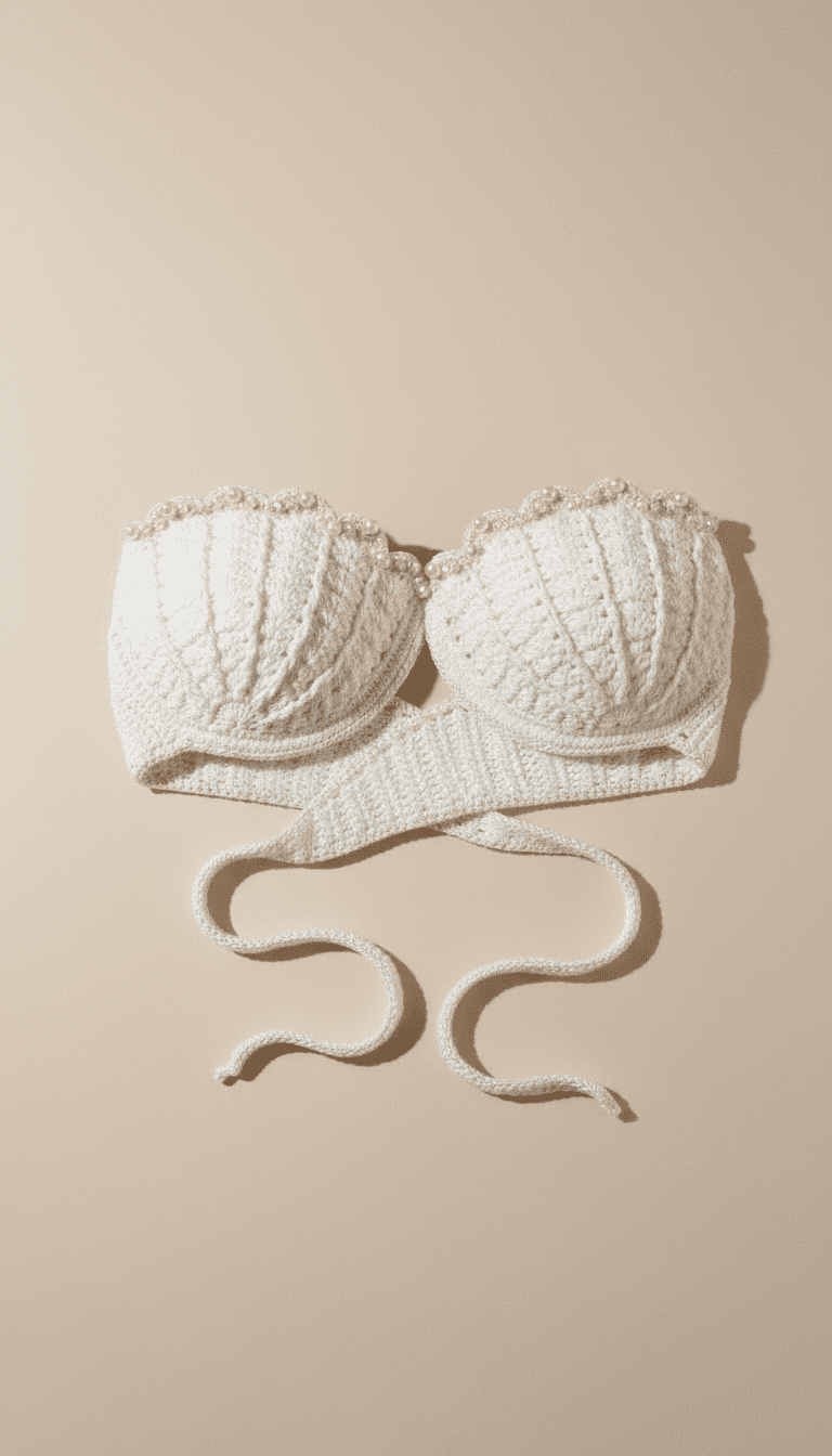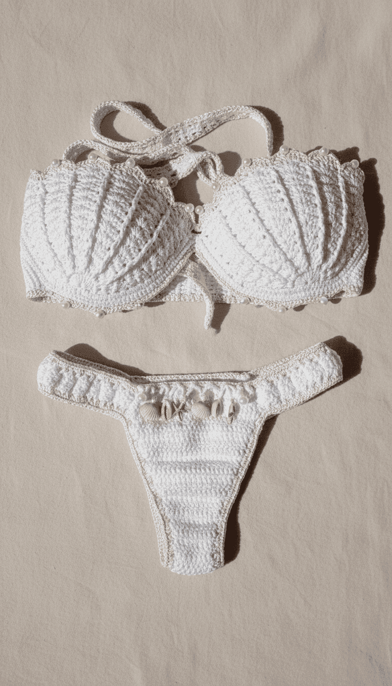 Inspirado nas sereias e na estética do litoral, o biquíni combina tons claros, textura artesanal e adornos naturais, criando um visual romântico, livre e atemporal.