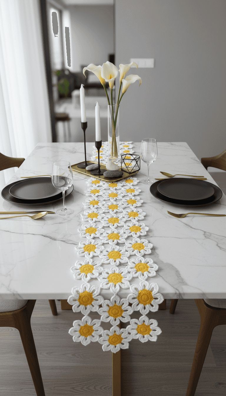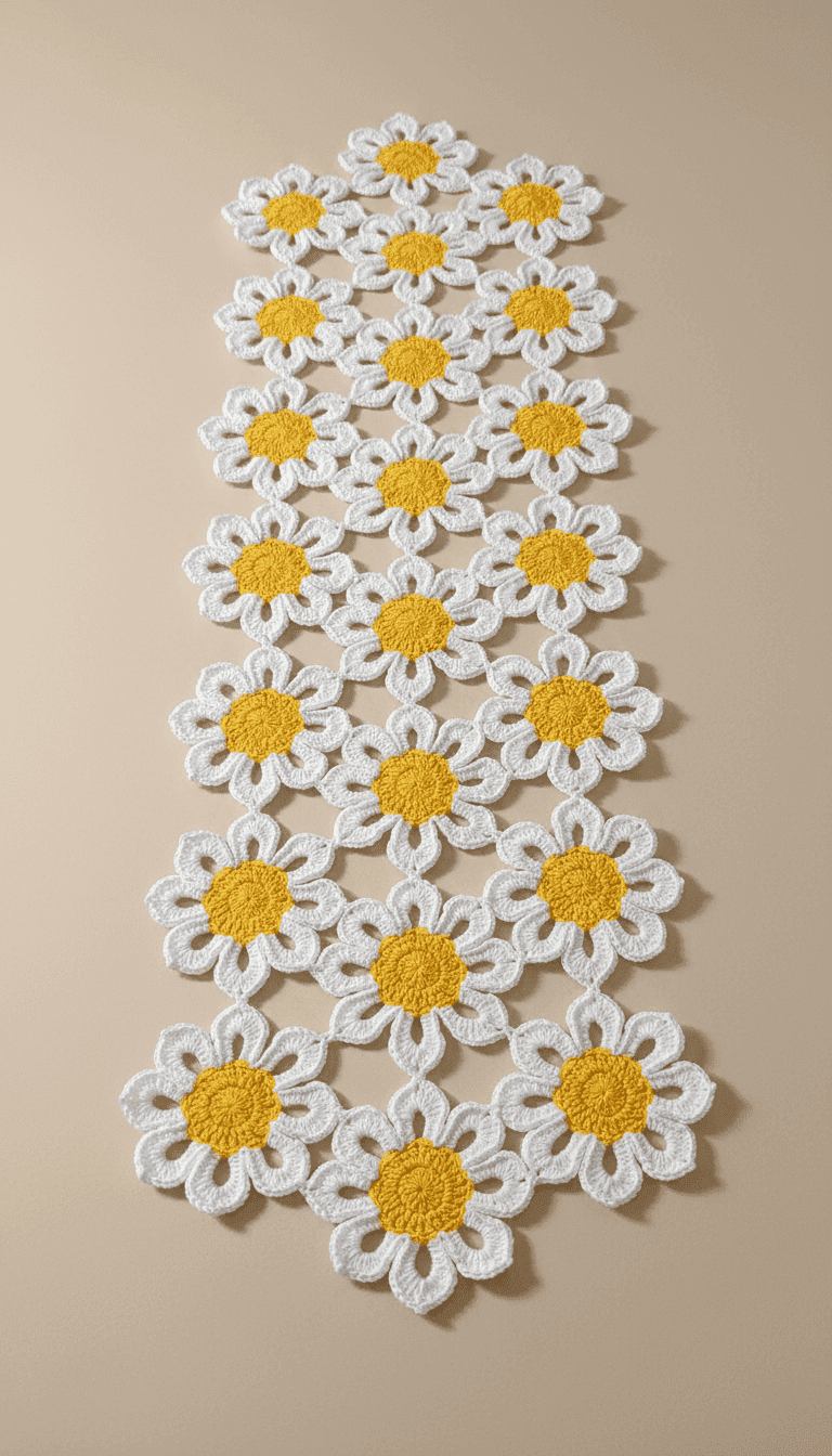 Com flores dispostas de forma harmoniosa e cores suaves, o Trilho de Mesa Margarida de Crochê se adapta a diferentes estilos de decoração — do rústico ao contemporâneo — trazendo leveza e sofisticação para qualquer mesa.